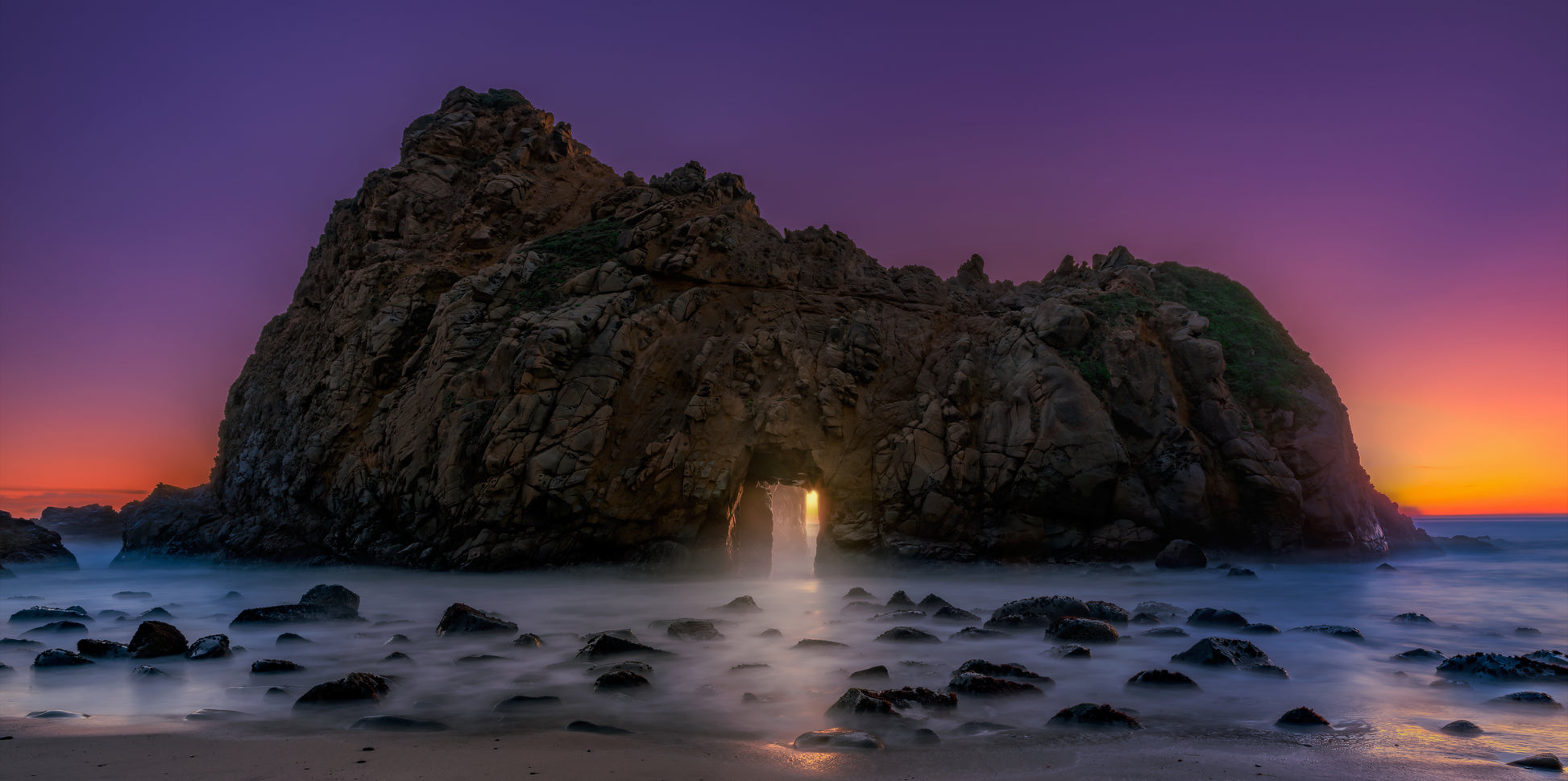 For a short time each year, the sun shines through the weathered hole casting a glowing light on the rocks for a very limited time each day. Making sure the weather cooperated with just the right amount of mist and sea fog proved to be more difficult than I thought, the sun moved fast with a few minute window to shoot. After a few days of repeating the process, I was able to get what I had imagined.