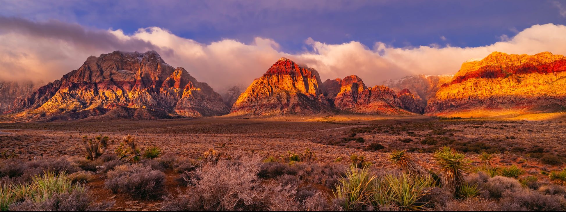 On a clear day from the Las Vegas strip you can see red mountains facing West. I had always wanted to get a better view of the area.I went early in the morning. It was windy and snowing on and off. I waited for the sun to break through and a few beams of light painted the side of the mountain. The beams highlighted the layers in the rock and the snow capped mountains.
